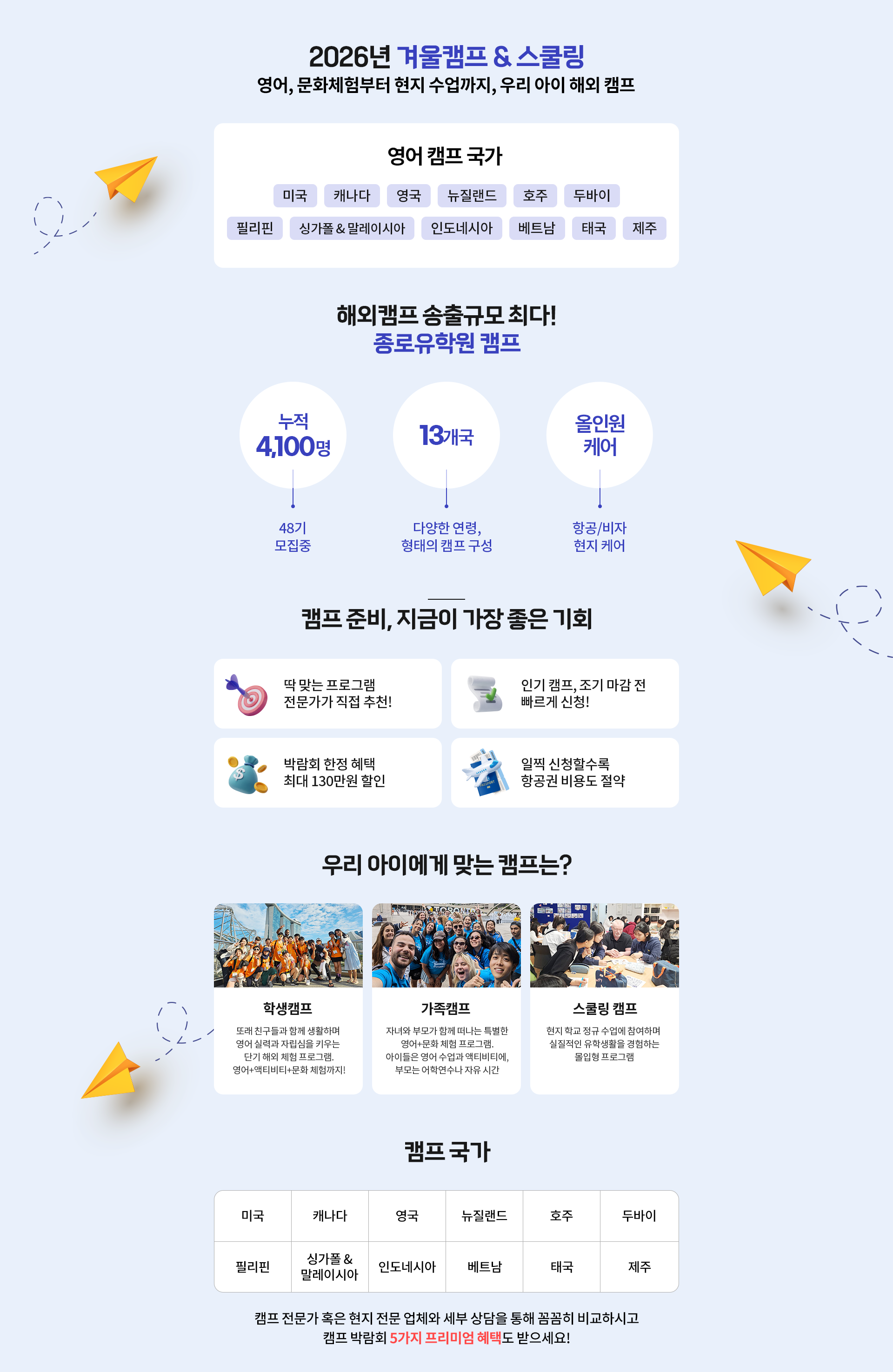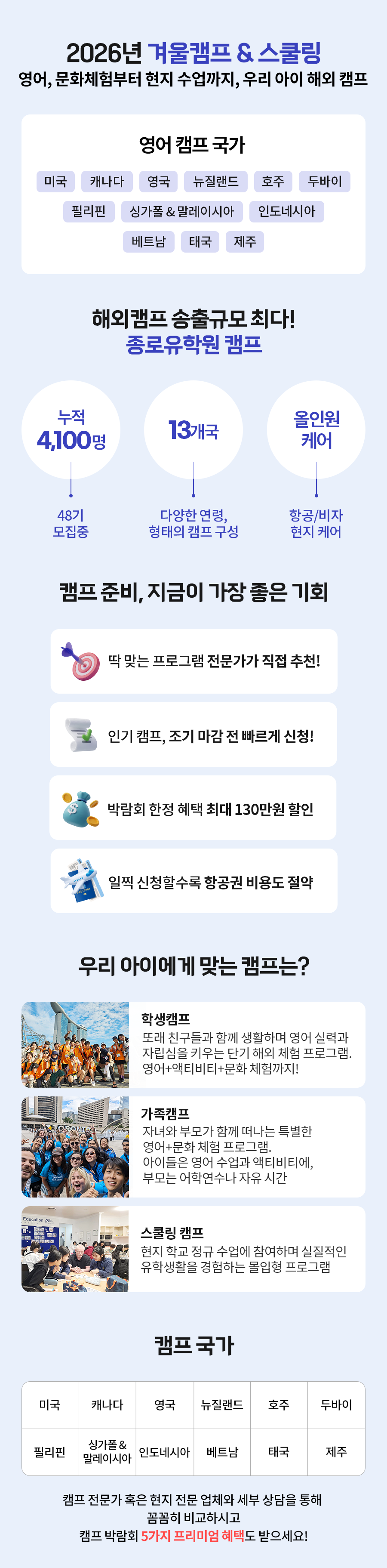 안전하고 알찬 해외 영어 캠프 프로그램이 한 자리에!